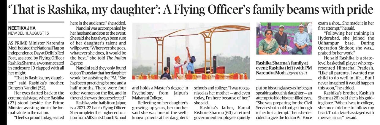 On 15th August 2025, Flying Officer Rashika Sharma, an alumna of All Saints’ Church Sr. Sec. School, Jaipur, created history as she stood alongside Prime Minister Narendra Modi to hoist the national flag from the iconic Red Fort during India’s 79th Independence Day celebrations.